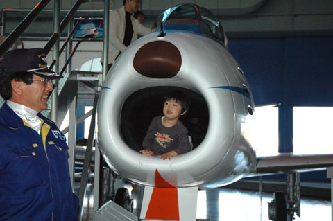 T-2練習機に乗り込んだ子供。背が低いから前が見えない模様。もう少し大きくなってから、フライトスーツを借りて着て、もう一度リベンジしような。