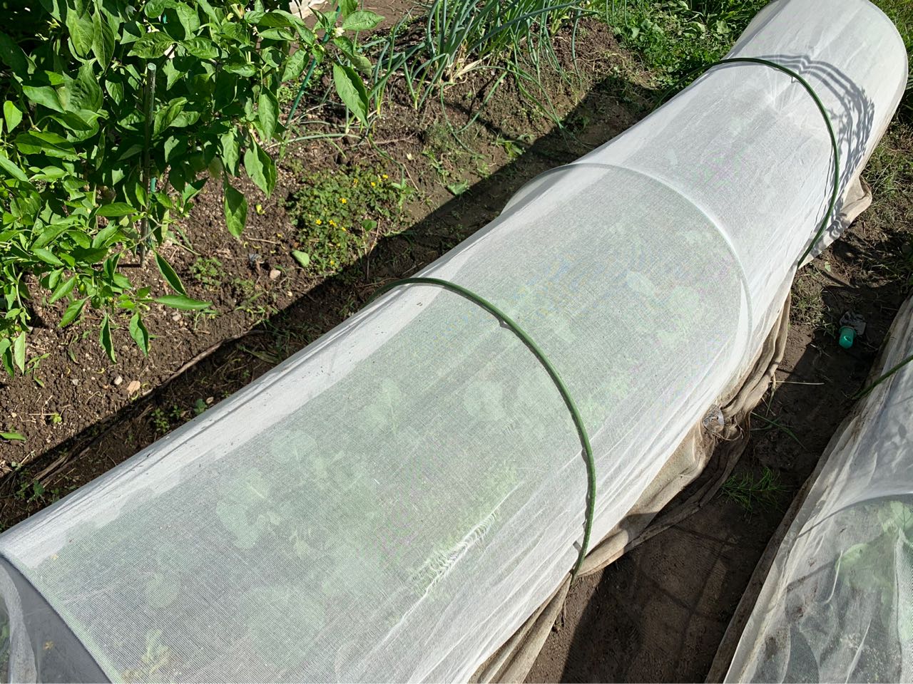 白菜の葉は、寒冷紗かけていても気を抜くとすぐに穴が開いてますね。